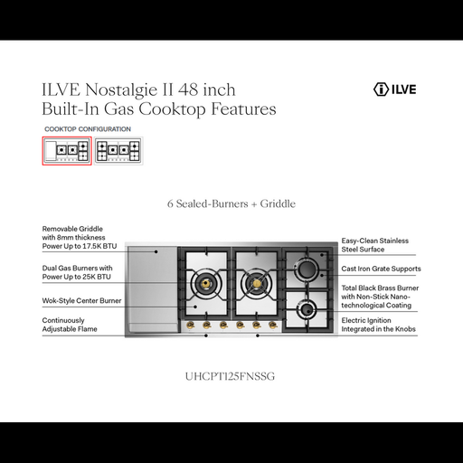 ILVE 48″ Built-In Gas Cooktop with 6 Burners, in Stainless Steel The taste of tradition, with a modern twist. The perfect blend of past and present...
