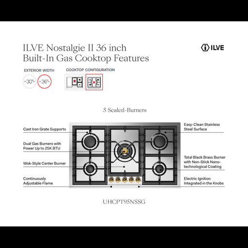 ILVE UHCPMT95 36″ Built-In Gas Cooktop with 5 Burners, in Stainless Steel A tradition of the contemporary kitchen that withstands the test of time....